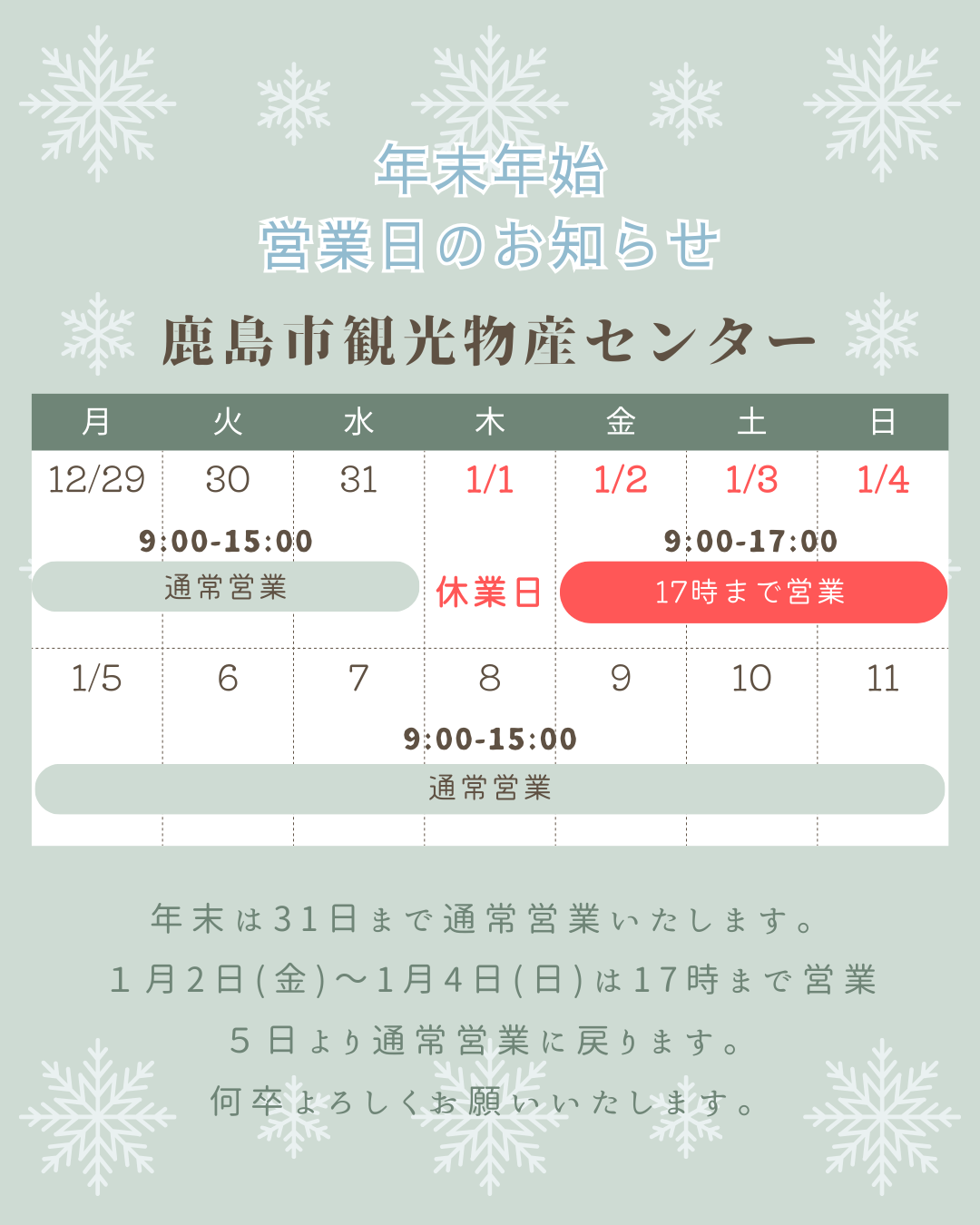 また、誠に勝手ながら元日1/1(木)は休業日とさせていただきます。